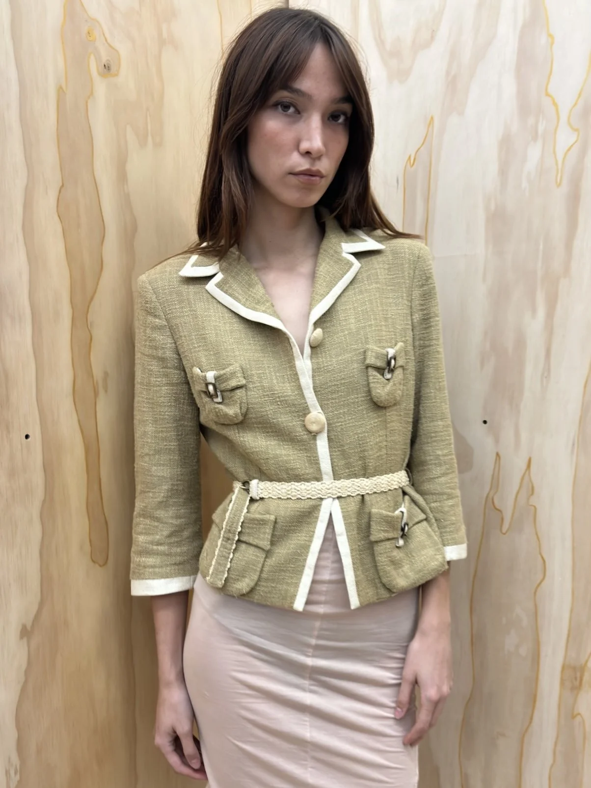 Tan cropped jacket with pleats and button closure